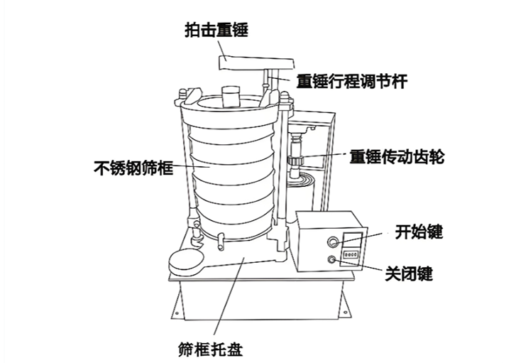 金刚砂拍击筛由铸铁底座、电机传动系统、执行机构及电器控制箱组成。底座能保证机身稳固;电机通过齿轮组驱动,实现运动转换。执行机构包括托举筛盘的摇杆和负责垂直敲击的锤头与拍击杆。工作时,标准筛置于托盘上,通过螺母固定。控制箱设有电源开关及机械定时器。这种设计使筛具在旋转的同时接受有节奏的顶击,使筛分精准。