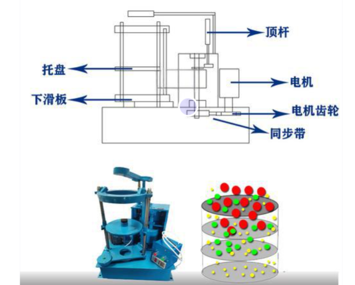 BZJ-300拍击筛主要由电机带动齿轮通过同步带传动到主轴上,经齿轮变速后主轴按要求的转速转动,主轴带动偏心轮使滑板做往复运动,带动安装在滑板托盘中的试验筛左右摇动,同时主轴带动顶杆齿轮转动,变速后顶杆齿轮通过凸轮顶击顶杆,顶杆使拍锤上下拍击试验筛上盖,使得试验筛、标准筛中的物料往复和上下振动,使小于试验筛筛面网孔的物料颗粒筛分进下层试验筛,如此层层筛选,使每层试验筛内只留相同粒度的物料。达到不同粒度的分离并确定此物料的粒度组成。