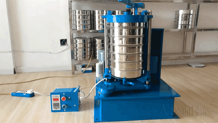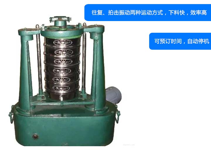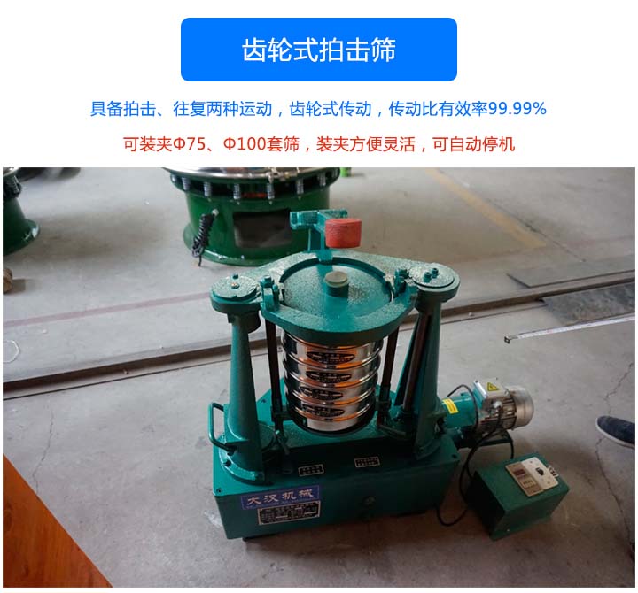齿轮式拍击筛主要由电机带动齿轮通过同步带传动到主轴上,经齿轮变速后主轴按要求的转速转动,主轴带动偏心轮使滑板做往复运动,带动安装在滑板托盘中的试验筛左右摇动,同时主轴带动顶杆齿轮转动,变速后顶杆齿轮通过凸轮顶击顶杆,顶杆使拍锤上下拍击试验筛上盖,使得试验筛、标准筛中的物料往复和上下振动,使小于试验筛筛面网孔的物料颗粒筛分进下层试验筛,如此层层筛选,使每层试验筛内只留相同粒度的物料。达到不同粒度的分离并确定此物料的粒度组成。