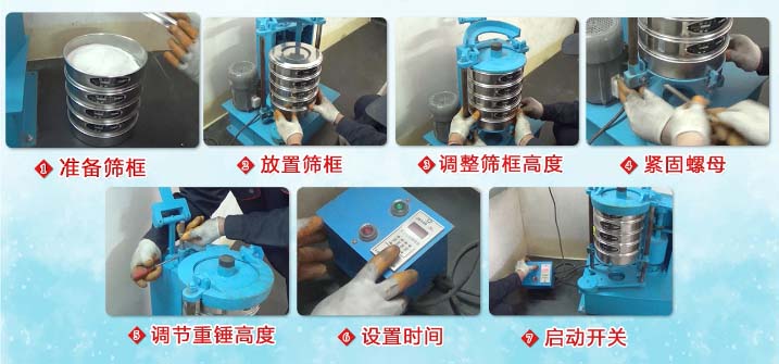 安装试验筛:松开托盘紧固螺丝,将托盘向下移动,装入装好物料的试验筛(分样筛、标准筛),然后托起托盘至合适位置,拧紧紧固螺丝,盖好翻盖,放下锤铁后,定好时间即可开机。采用100、75夹具可使用相应尺寸套筛,特殊尺寸可定制。